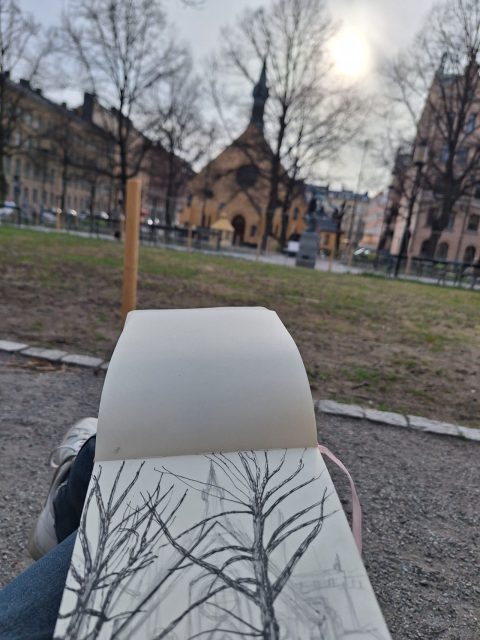 Jag tänkte mig dock inte för utan greppade först en vanlig skisspenna av blyerts, men kom snabbt på mig själv och suddade helt sonika bort allt och började om med den lila träpennan. För att få en idé om vilka pennor som skulle användas var och få mer känsla för dem provades de på kladden. Jag testade också att spä ut med lite vatten – varvid det tunna papperet skrynklade sig likt en berg-och-dalbana.
