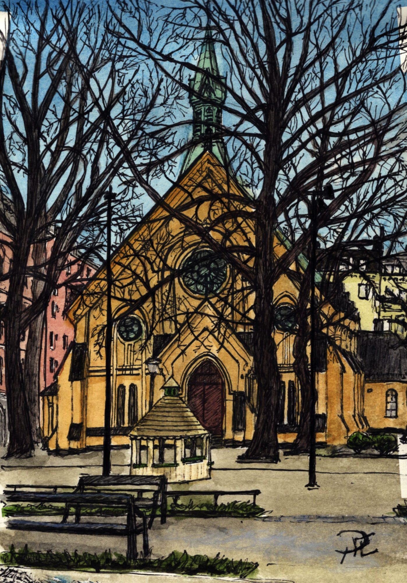 De här materialproblemen gjorde att man fick frångå purismen i anslaget med sex pennor och göra vad man kunde. Jag tog därför hjälp av vitmedier, framför allt en posca vit akrylpenna som fick komma in istället för den fallerande gula markern. Fler lager av akvarellpennor lades in, och jag utnyttjade också till det yttersta alkoholmarkern för att göra bilden gradvist allt mörkare i skuggade partier och mot botten.