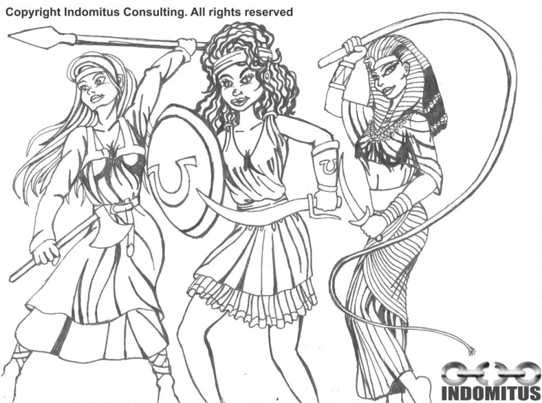 Från vänster till höger – en traditionellt klädd tjej från Norden med yxa och spjut, i mitten en Grekisk krigare med bronstäkt sköld och ett böjt svärd, från Egypten en högättad stridis med piska och lång dolk