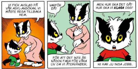 ”Migrationsverket har gett ut en tidning med Bamse. Den där tidningen har de gjort för de som inte vet om de får stanna i Sverige, och där finns det en familj som får stanna, och en som inte. Jag undrar vad ni, som är barn, tycker om det?”