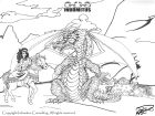 Sedan var det bara att scanna in, sätta igång Photoshop och måla på. Jag behöll de tuschade linjerna för en slags blandstil med drag av serietidning och ren målning, och använde akvarellfiltren för penslarna i Photoshop. För stadsmuren använde jag ett tegelmönster som jag mångfaldigade för att efterlikna sten, och för klipporna skapade jag likaledes en stentextur som fungerade OK. Med akvarellfärger målade jag ett slags schabloniserat gräsmönster med skugga under figurerna. Resultatet kan ses nedan.